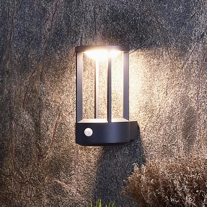 Albaldah LED outdoor wall light with sensor control - designed as a modern lantern Albaldah is inspired by a classic lantern and realised as a modern light. The dark grey aluminium body consists of an angular wall bracket and an upward-facing cylinder. The latter supports a top plate with four narrow struts, the underside of which is fitted with the LED light source. The warm white light shines outwards through the wide open sections between the struts and gently illuminates the wall and the area in front of it over a large area. The wall light is switched on automatically when people are active in the area in the dark; Albaldah is equipped with a daylight and motion sensor for this purpose - IP code: IP65 - Run-on time for motion detection: 8 s to 5 min - Ambient temperature during operation: - 20 °C to + 50 °C