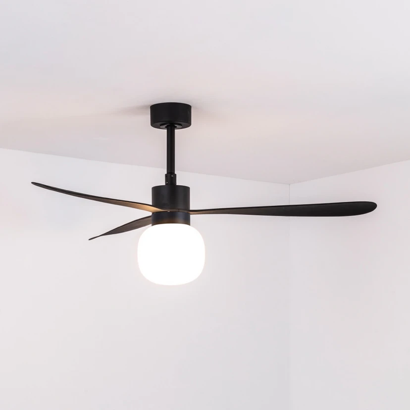 Ceiling fan Amelia Ball with dimmable LED lightThe ceiling fan Amelia Ball was designed by Héctor Serrano and fascinates with its modern, curvy design. It is equipped with three ABS blades and is suitable for rooms up to 18 m² in size. The integrated LED light source shines in warm white. Remote control (without batteries) with timer included. Incl. alternative extension rod.FeaturesThe warm white beaming LED light source is dimmable, so that the room light can be adjusted to the atmosphere in each case.Adjustable summer and winter mode. Winter mode can save energy by evenly distributing the heated air.There are 6 speeds as well as 6 wattages can be set via the included remote control.The remote control is equipped with a timer for 1 hour, 4 hours and 8 hours respectively. Vacation mode can be set, i.e. every 2 or 3 hours the lights turn on for 5 minutes and then off again.Technical dataPower per speed:- 5 watts at 69 rpm- 7 watts at 99 rpm- 10 watts at 123 rpm- 15 watts at 143 rpm- 19 watts at 162 rpm- 28 watts at 189 rpmAirflow: 153 m³