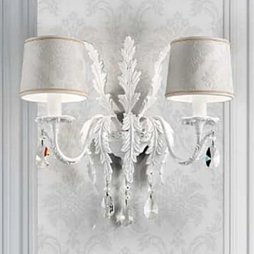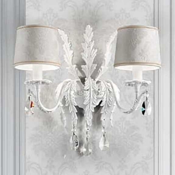 The white metal frame of the 2-bulb Angelis wall light is decorated with soft feathers. White lampshades made of the finest damask not only produce pleasant lighting - the jacquard pattern itself, which is typical of damask, is captivating as it creates beautiful light reflections. The gold-coloured borders on the upper and lower edges of the fabric lampshades offer additional decoration. The droplet-shaped Asfour crystals hanging from the wall light sparkle in the light that escapes downwards.