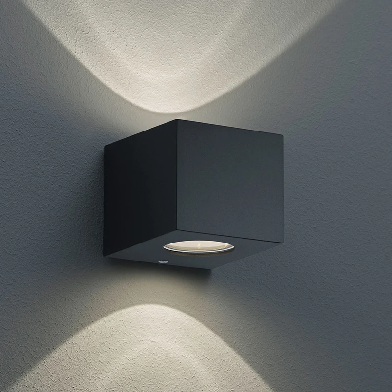 The Cordoba outdoor wall light is designed in the shape of a cuboid and blends wonderfully into modern outdoor areas. The body is made of plastic with a matt surface. The light of the LEDs is emitted upwards and downwards through two openings. Thanks to the included covers with openings in different shapes, interesting patterns of light can be produced or Cordoba can be transformed into solely an uplight or a downlight.