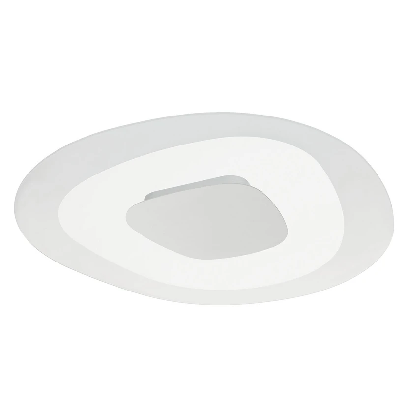 The LED ceiling light Antigua captivates with its friendly, organic-looking appearance and is suitable as an eye-catcher for private and public interior areas. Antigua combines white and transparent sections with an asymmetrical, not quite round design. The LEDs are placed on the top of the central holder made of white painted metal. Their warm white light is radiated to the ceiling and reflected downwards through the glass shade, making the matt outer section shine impressively.