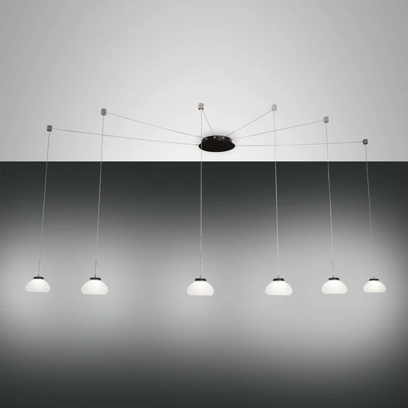 Six-flame LED pendant luminaire Arabella with decentralised suspension