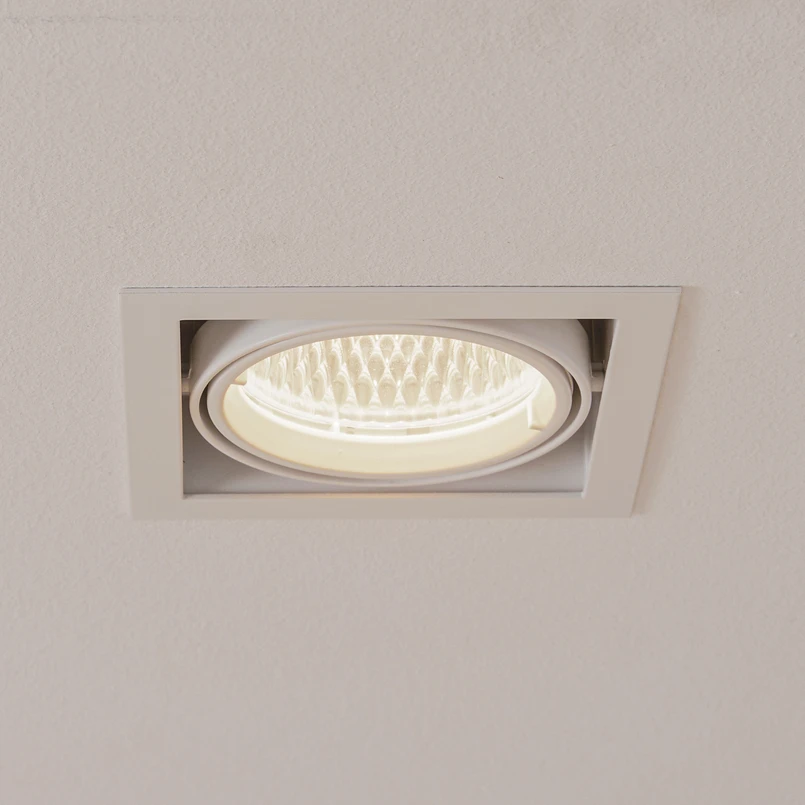 LED recessed ceiling light Adin: high flexibility in light direction and usability The individually mounted LED recessed ceiling light Adin is ideal for general lighting in private or public areas. Thanks to its very good colour rendering, it is also ideal for use above sales and presentation areas. Made from a square frame and round aluminium head, the recessed lamp emits warm white light through a clear polycarbonate diffuser. The head can be swivelled through 40° so that the light direction can be changed as required. - Including ballast - Beam angle: 34° - Glare control: UGR < 13 - Chromaticity tolerance (initial MacAdam): 2