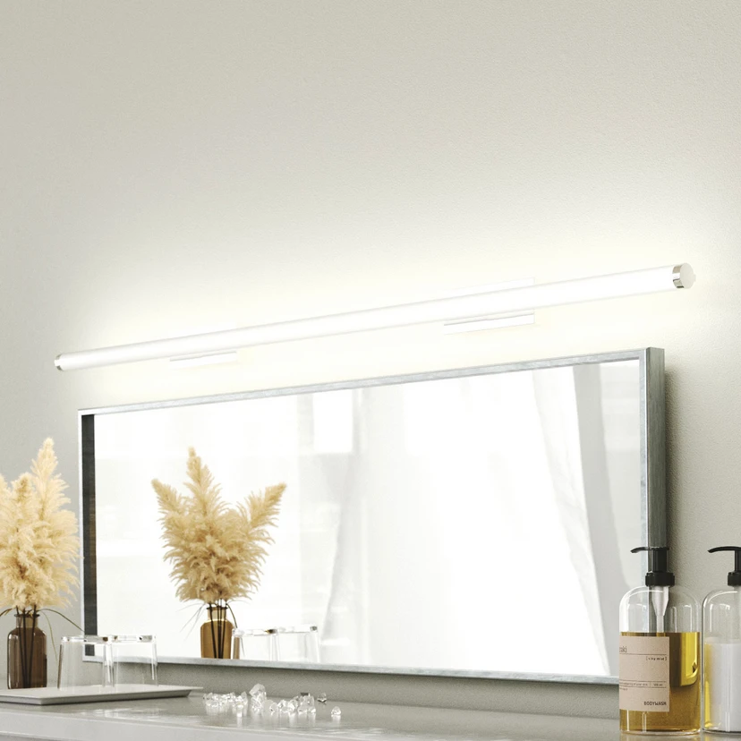LED bathroom wall light Derin: Ideal for mirror lighting The Derin LED wall light for the bathroom is a light source with a modern design. The metal wall mount and the two end caps of the diffuser are bright chrome-plated. The diffuser itself consists of an opal polycarbonate tube bulb, in which warm white LEDs are installed. Thanks to its construction in accordance with IP code IP44, the Derin LED wall light can withstand splashing water on all sides, as can occur in bathrooms. Ballast included.