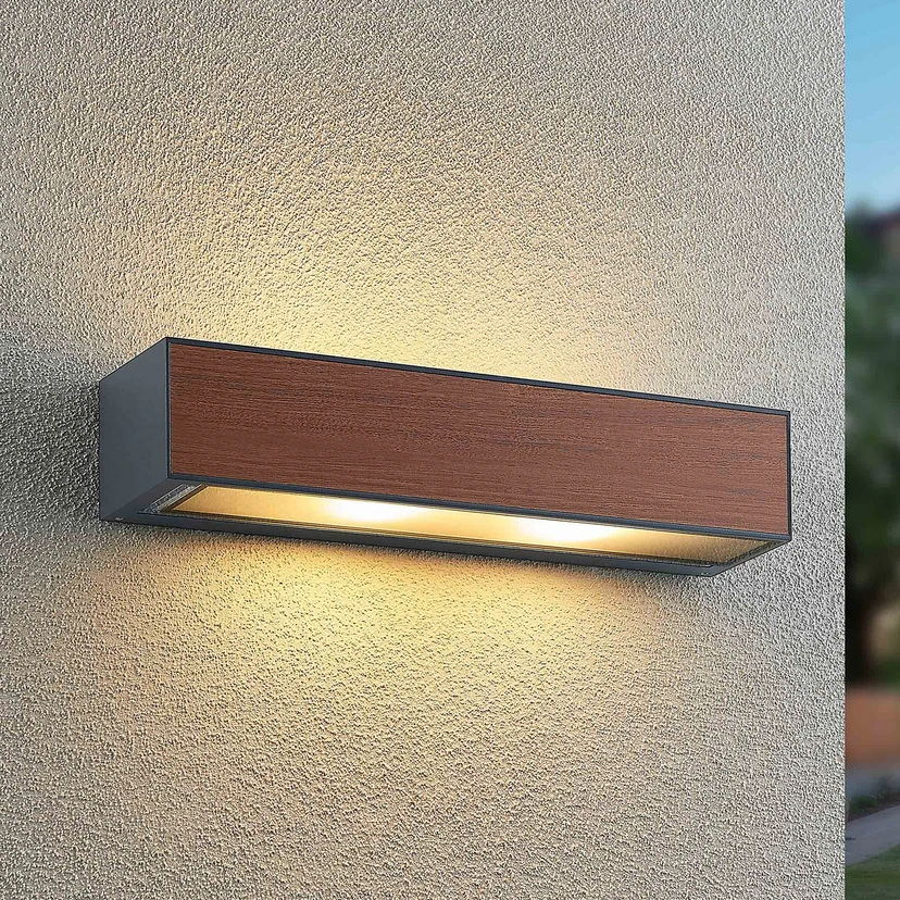 Elongated Miraz outdoor wall light in an attractive wood look, double light emission upwards and downwards The front cover of this outdoor wall light has been given a wood-look finish, which gives Miraz a more natural effect and warmer appearance. Otherwise, the body is made of die-cast aluminium and has a dark grey surface, while there is a robust glass insert at both the top and bottom, allowing the light to escape from these two points. As a result, the light is relatively glare-free and the light image on the wall looks quite effective and is easily recognisable from a distance. An effect that is enhanced if not just one light is used, but several are installed in a row to provide sufficient brightness around the house so that it is easy to find your way around when it has already become dark and the daylight has faded until the next morning.