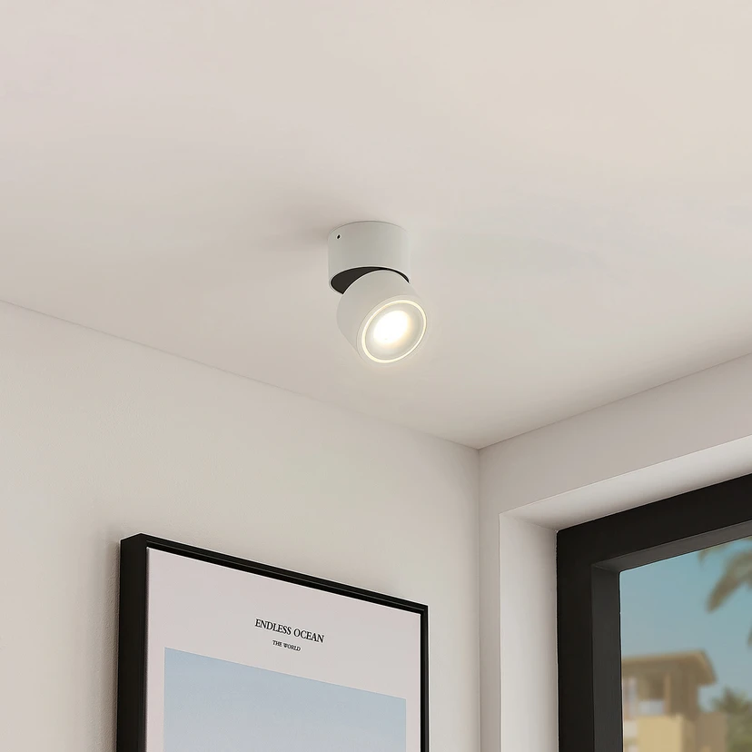 Rotatable and swivelling LED downlight Rotari in white The small LED downlight Rotari impresses with its modern design and flexible lighting options. Its head can not only be rotated by 350° but also swivelled by 90°. The aluminium housing is equipped with a built-in reflector that has a beam angle of 34° and enriches the room with warm white light (3,000 K). If required, the brightness of the light can be adjusted with a leading edge dimmer or trailing edge dimmer and has a CRI value > 90. The driver is integrated in the housing.