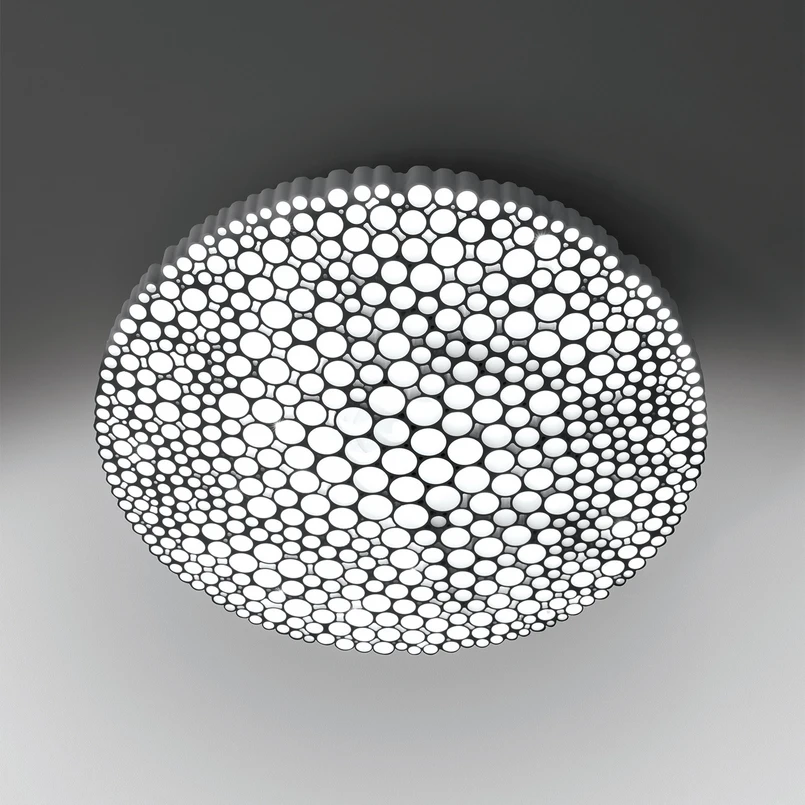 Calipso LED ceiling lamp controllable via App - designed by Neil Poulton The unusual honeycomb structure of the Calipso LED ceiling light's shade is based on a computer-processed image of the moon. The result is a design that inspires with its natural beauty and organic-looking irregularity. Calipso emits homogeneous light into the room and to all sides and is ideal for ambient and area lighting in both private and public areas. The Calipso ceiling light can also be mounted as a wall light and thus provides atmospheric additional lighting when switched on. When switched off, it can be used as a decorative object on any wall. Another impressive highlight of Calipso is that it can be controlled using the Artemide App (available for iOS and Android). The App can control up to 500 individual devices and works via the Bluetooth Lowe protocol. Calling up preconfigured or self-created scenes is child's play, as is adjusting the light. Those who want to create and operate more complex lighting concepts have the option of working Cloud-based and creating a multi-network via WLAN. Neil Poulton, who is behind the design of the Calipso ceiling light, was born in Scotland in 1963 and now lives and works in Paris. The multi-award-winning technology and luminaire designer often works for the renowned lighting company Artemide, for whom he designed the Veio light, which won the "Menzione d'Onore Premio Compasso d'Oro 2011" - made in Italy