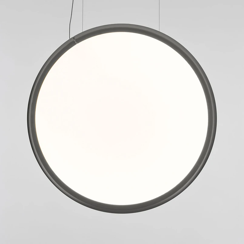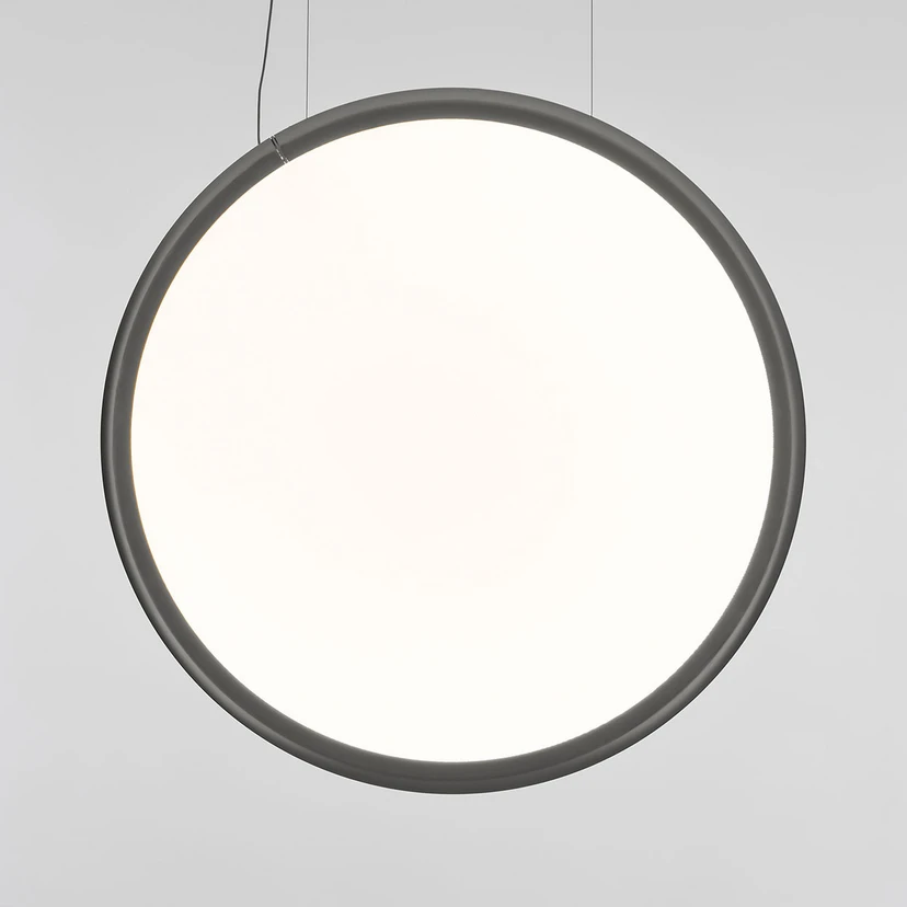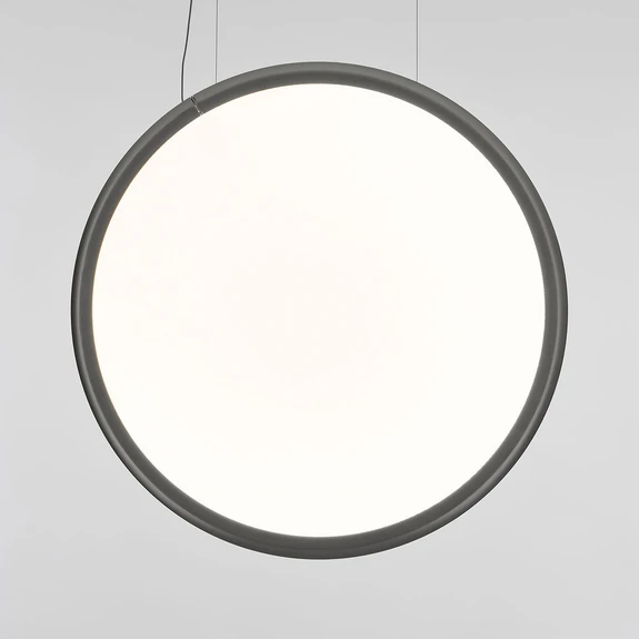 Controllable via App - Discovery Vertical LED pendant light The Discovery Vertical LED pendant light combines maximum efficiency and state-of-the-art technology, as the completely transparent PMMA diffuser only becomes visible when the light source is switched on. The diffuser is framed by a narrow aluminium ring whose slender form is inspired by bicycle rims. Discovery Vertical is visually unobtrusive thanks to its restrained design and illuminates the room when lit with an evenly distributed light that is directed into the diffuser by the LED strip in the ring. The light can be controlled via App (iOS and Android); it can be switched on and off, dimmed and various lighting scenarios can be created. Artemide founder Ernesto Gismondi designed and continuously developed the Discovery light series. Artemide is an Italian lighting company that he founded in 1960 and is known for its own research facilities. The Vision is to create unique lights to enhance human well-being through research into materials, technology and socio-cultural aspects.
