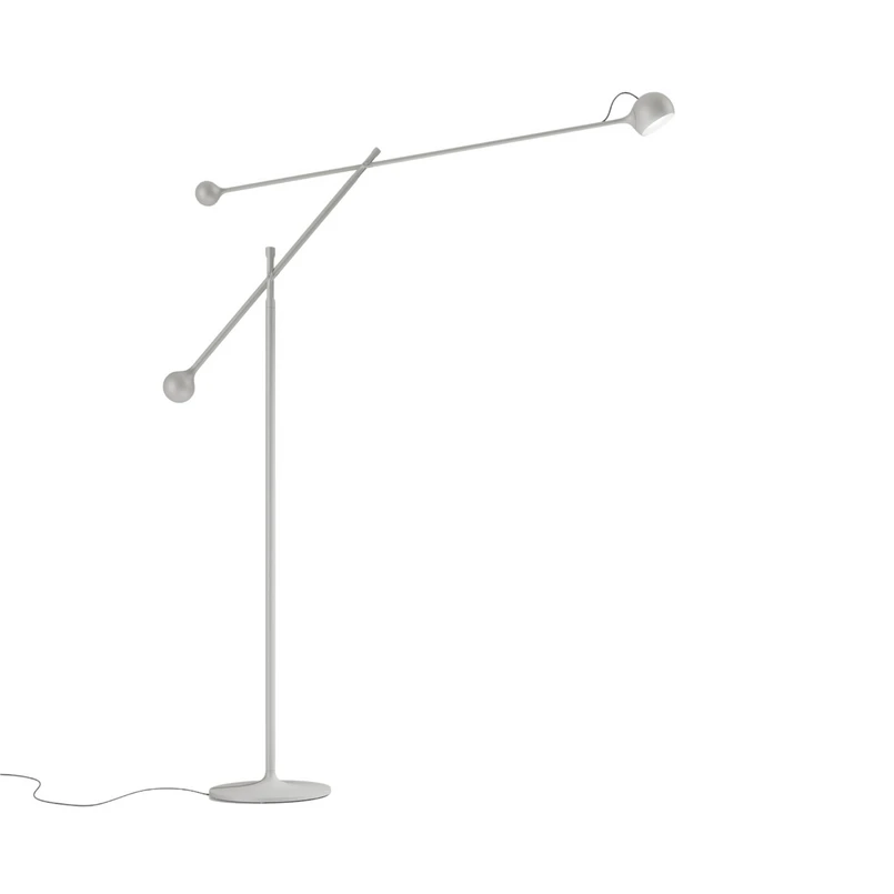 Ixa LED floor lamp with dimmer and adjustable frame with three arms The Ixa luminaire series by the Italian premium manufacturer Artemide is a concept by the design and architecture studio Foster Partners, which was founded in 1967 by the renowned British architect Norman Foster. The characteristic feature is the almost spherical head made of aluminium, which is kept in balance in this LED floor lamp by two counterweights on the two upper sections of the steel frame. In addition to the joints at the intersections of the arms, the head can be rotated all around so that the direction of the light output and the design of the luminaire can be variably adjusted. The warm white light, which is also characterised by good colour rendering (CRI 90), is switched and dimmed via push-buttons on the head. Ixa shines in living, recreational and business spaces as an expression of functional, productive and sustainable intelligence through reduction and simplification - the result of sound design know-how.