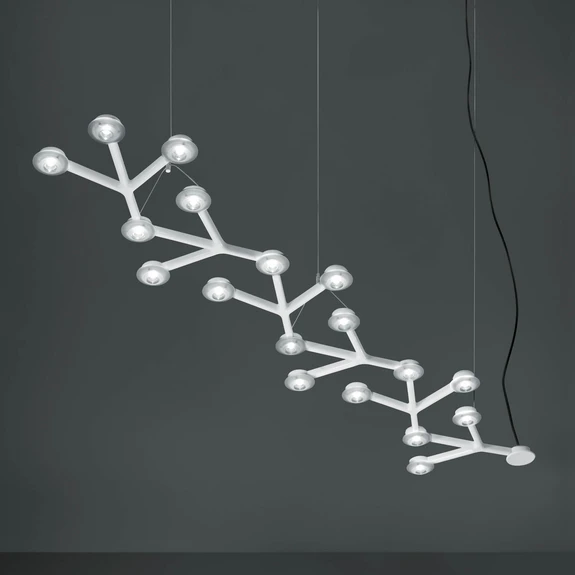 The LED Net Line pendant lamp by Artemide is characterised by its very special shape, which is composed of several individual aluminium elements in white. The two Italian designers Michele De Lucchi and Alberto Nason jointly designed the LED Net Line light series for the lighting manufacturer Artemide. The interesting pendant lamp is equipped with a total of 18 warm white LED light sources behind covers made of methacrylate, each of which is attached to the ends of aluminium arms. LED Net Line is suitable as a light source above a dining table in a private environment as well as for various representative public areas. Via Bluetooth connection, the light of the LED Net Line pendant lamp can be switched and dimmed in a modern way via smartphone or tablet with the Artemide app available free of charge for Android and iOS.