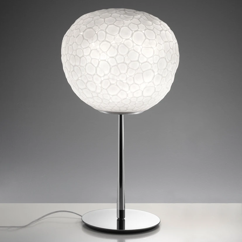 Decorative Meteorite table lamp with base by Artemide The Meteorite table lamp - a design by the designer brothers Pio & Tito Toso - impresses with its special lighting character. It is the result of a special manufacturing process in the Venetian Tradition, in which the glass is dipped in acid and then treated with Sander. The two designers, who set up their own Studio soon after studying architecture, come from Venice and used their knowledge of this traditional manufacturing technique to develop Meteorite. The name Meteorite derives from the optical proximity to the cosmic structure of the same name, which is created thanks to the glass structure and shape - manufactured by Artemide in Italy