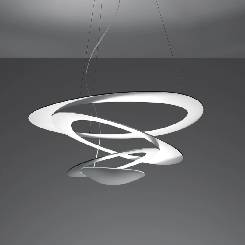 The slim aluminium discs are connected at one point and follow a flowing vortex that seems to turn downwards. At the bottom, it ends in a semicircular shape that directs the light back upwards. The incomparable shape creates an equally unique lighting effect. Dimmable via push dim.