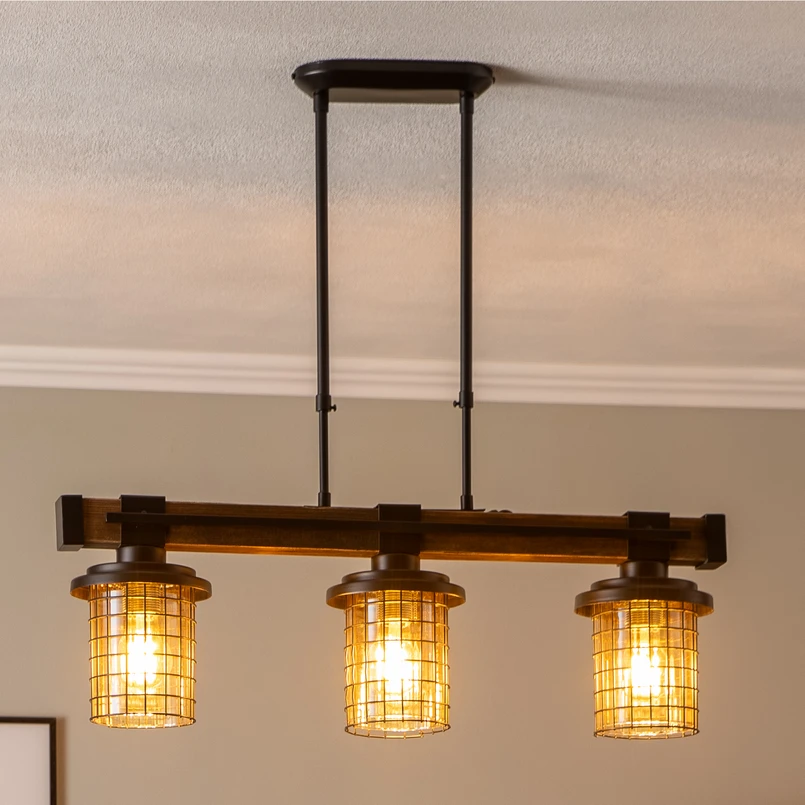 The AV-4216-3EY pendant light combines a stylish combination of metal, wood and glass, giving any room a special touch. With its antique brown finish, it blends seamlessly into various interior styles and creates a warm, inviting atmosphere. This light is ideal for dining rooms and kitchens, where it serves as a central element that shapes the ambience.
