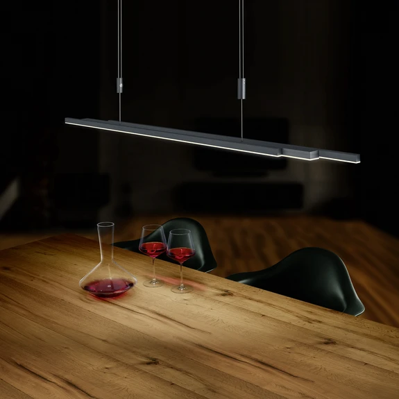 Smart and extendable LED pendant light L-lightLINE with "vertical dimmable" The extraordinary LED pendant light L-lightLINE consists of three rectangular, elongated lighting elements that can be moved along their length so that they can be extended from 110 cm to up to 203 cm in length. Thanks to these ingenious options, guests having to sit in the dark at an extended table is a thing of the past. The LEDs produce a very bright light when required and illuminate even large rooms with dark furniture effortlessly right into every corner. The additional option of being able to adjust the height of the light gives you even more flexibility. It is infinitely adjustable between a maximum of 150 cm and a minimum of 85 cm. But it's not just the batten light that is spectacular: the clever design from Hausen BANKAMP has a lot more to offer. Firstly, the light is equipped with "vertical dimmable" technology, which allows the brightness and light colour to be dimmed by simply tilting the light element. The light's sensor reacts from a tilt angle of just 12°. Hat the light has reached the desired setting, the light element is released again and the setting is maintained. The further the light is dimmed down, the warmer and cosier the light becomes, until approx. 2,200 K is reached. In this way, the LED light always provides the desired lighting ambience. Note: No dimmer must be connected upstream. Another highlight of the L-lightLINE light is the built-in ZigBee module. This module makes it possible to connect the light to a ZigBee-based gateway and then control it via App. As ZigBee technology is used in many Smart Home systems, this light can be easily integrated into an existing network and added to it. However, the LED light is also suitable for Smart Home beginners: Simply install a ZigBee-capable gateway, connect it to the light and all the benefits of Smart Home can be utilised.