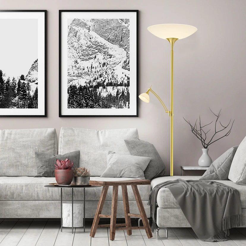 LED uplighter Meisterwerke made of brass with reading light - opal glass bowl-shaped lampshade With the use of high-quality materials and the high manufacturing quality guaranteed by the German manufacturer BANKAMP, this LED floor lamp meets even the highest demands. The main light source is in the open opal glass shade in the shape of a bowl, so Meisterwerke provides indirect ambient lighting as an uplighter. There is also a reading light, which is attached to a double arm at the side and can be rotated and swivelled thanks to two joints. The entire frame is made of Massive brass; the matt metallic finish is complemented by shiny details. A touch dimmer at the base of the reading arm enables switching and dimmable operation.