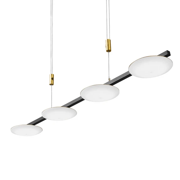 Pure Up LED pendant light in black and gold with four flat lampshades The Pure Up pendant light is a stylish and effective choice, particularly for table lighting in a modern interior design concept. The light from the Luce Elevata series is manufactured by BANKAMP at its German production site in impeccable quality. Its four lampshades in a flat lens shape are each closed at the bottom with an opal diffuser, ensuring that the warm white light is diffused evenly. The upper covers of the lampshades, the long bar, the canopy and the two rise and fall mechanisms (allow height adjustment from 90 to 150 cm) are made of aluminium and, with their trendy mix of black and gold leaf, give the pendant light its special character - Light output can be adjusted via an external trailing edge phase dimmer