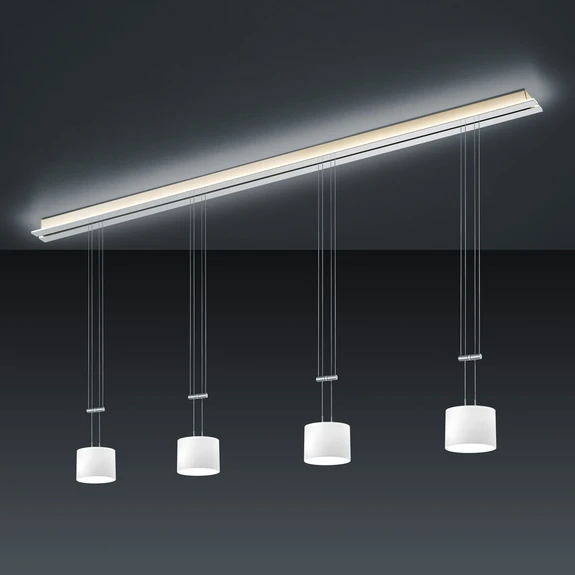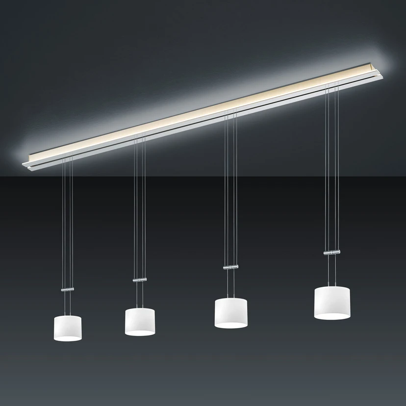 LED pendant lamp Strada Gracia consists of a ceiling rail, which creates an indirect light directly on the ceiling with its LED lighting units. The four pendants are then attached to the rail. They can be moved along the entire length of the rail and are very easy to adjust the suspension thanks to the pulley system. The opal white glass shades of the pendant lamp hide the numerous functions that make it a real functional talent.