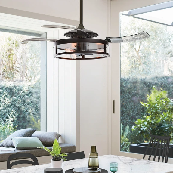 Antique black ceiling fan Fanaway Classic with retractable blades With its antique black finish and smoky grey acrylic blades, the Fanaway Classic ceiling fan with lighting goes well with many furnishing styles. Fanaway Classic not only creates pleasant air conditions, but also provides adequate room lighting. Functions Three speeds can be selected. With an air flow of 180 m³/minute, a room of up to 20 m² is pleasantly cooled. The fan can be operated either in forward or reverse mode, so that it ensures a pleasant room climate not only in summer but also in winter. The Fanaway Classic ceiling fan is controlled using the remote control supplied (requires 2 x AAA batteries - see accessories).