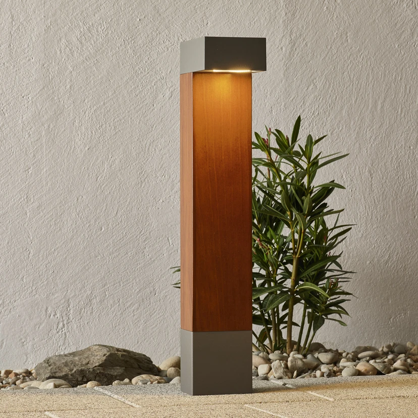LED bollard light made of wood and aluminium, IP65, with screw-on base The high-quality LED bollard light is made of Accoya wood, aluminium and stainless steel. This combination radiates durability, modernity and elegance and suggests a well thought-out product. The special BEGA Unidure coating technology ensures durability, as it is an extremely weather-resistant powder coating. Its elegant and natural look makes the light look good anywhere outdoors, for which it is predestined due to its high IP code IP65, among other things. With its warm white LEDs, the path light provides uniform and glare-free illumination of the ground surface and directs the light exactly where it is needed thanks to the downward-facing reflector. A screw-on steel base is also supplied, which is hot-dip galvanised and suitable for mounting the light on a foundation provided by the customer or another fixed surface, such as paving slabs. This light combines functionality and aesthetics and provides safe lighting for the garden and walkways in the dark. - suitable for through-wiring - with BEGA Thermal Switch - temporary thermal cut-off to protect temperature-sensitive components