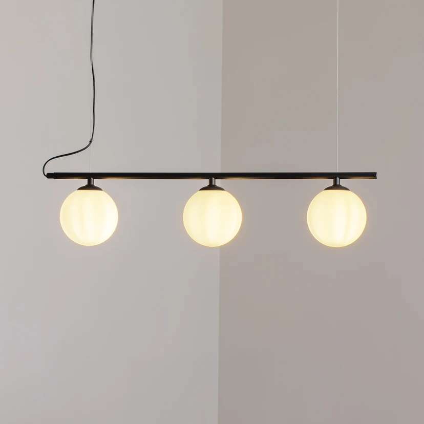 The Beryl pendant light, with 3 bulbs, features a modern design that impresses with its combination of black metal and frosted white glass. This stylish light is not only eye-catching, but also offers the option of adjusting the light intensity individually via an external dimmer. The 3-bulb design ensures even illumination in various rooms such as the living room, kitchen or dining room, creating a pleasant atmosphere.