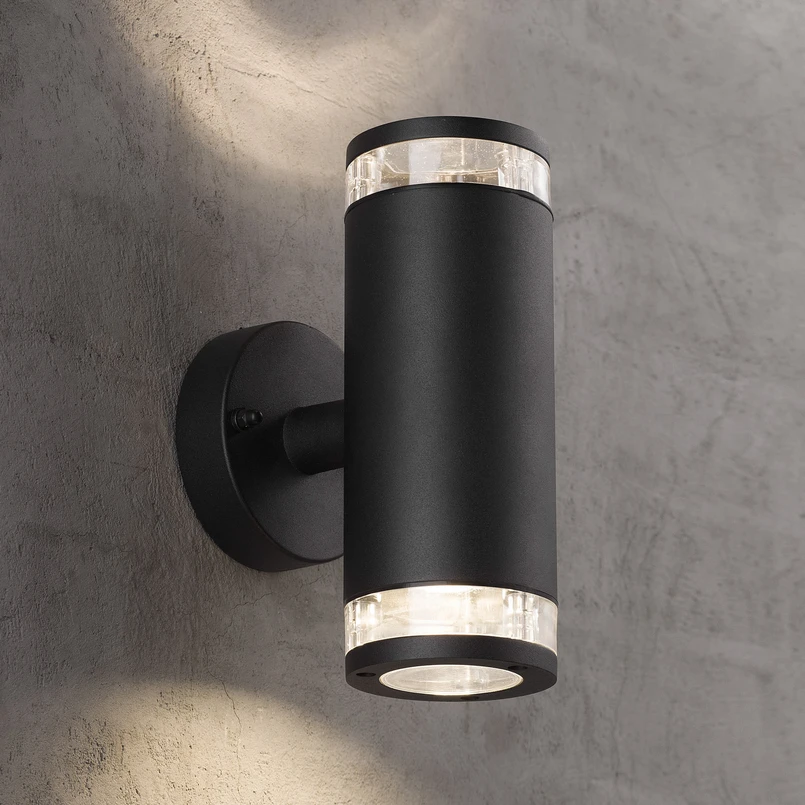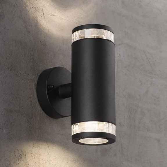 With a beautiful light effect up and down, the Birk exterior wall light, which is very simple in its form, becomes a highlight on the facade, whether mounted individually or arranged in several units around the building. The wall light consists of a round bracket and a cylindrical body, which is closed at the top and bottom by a clear diffuser. Unlike many other lights, this one has a higher design and is decorated with a metal ring, so that the light does not only exit downwards but also sideways, conjuring up a strip of light on the façade and in the surroundings.
