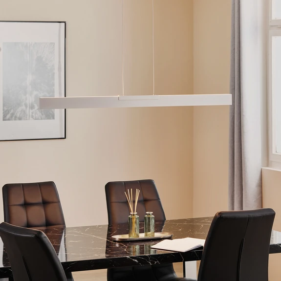 Simple, elegant, modern - LED pendant lamp NanoThe modern beam pendant from Bopp convinces with a simple and elegant design as well as a sophisticated functionality. Made of high-quality aluminium in Germany, the Nano LED pendant light has two LED strips, each of which is attached to the upper and lower side of the light body. Thus, the LED pendant lamp emits direct light downwards as well as indirect ambient light upwards without glare. Both lights can be separately adjusted in colour temperature by means of an integrated touch dimmer. The pleasant warm white light of the LEDs becomes even warmer when dimmed down, creating a cosy atmosphere. If desired, the upper and lower light can be switched separately in different colour temperatures to create very individual lighting scenarios.Thanks to its simple design, the Nano LED pendant luminaire fits into any modern interior. It is perfect for lighting above a stylish dining table and always impresses with its high quality and sophisticated functionality.