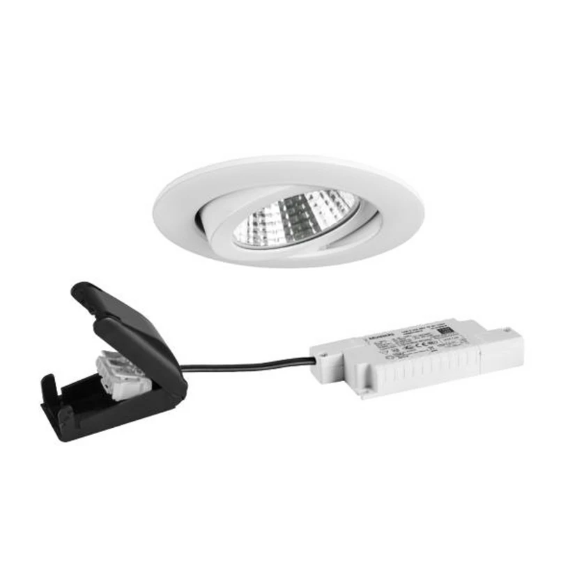 LED recessed downlight BB03 with LED driver (phase cut-off - RC dimmable) and connection box Completely including dimmable LED driver and connection box, this compact LED recessed spotlight swivels 30° all around. Its brightness can be regulated via an external phase-cut dimmer and it is ideal for illuminating corridors and many other rooms in private and commercial environments. The recessed mounting in ceilings with a thickness of up to 1.3 cm is done without tools thanks to installation springs. - Reflector silver with rotationally symmetrical deep-wide light distribution - Cover made of transparent polycarbonate for optimal light distribution - Including electronic control gear, phase cut-off dimmable and connection box - No cover with thermal insulation material