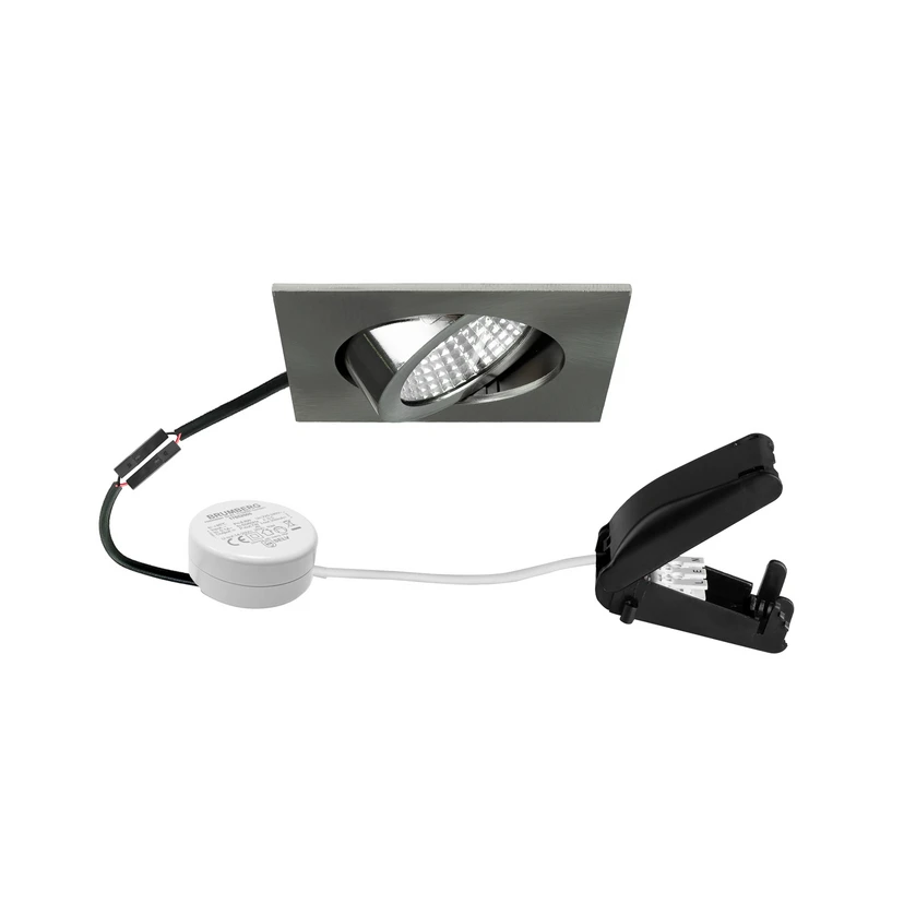 LED recessed spotlight BB05 with connection box and trailing edge dimmable (RC) driver The square BB05 LED recessed spotlight made of aluminium is suitable for both private and public interiors, from hotel event halls and corridors to living rooms. It is fitted with warm white LEDs, which sit in a head equipped with a silver reflector with rotationally symmetrical deep-wide beam light distribution, which can be moved all round so that the light beam can be directed to the desired area. An LED driver dimmable via trailing edge dimmer, a connection box and the mounting springs for tool-free attachment are included - Including LED converter; externally dimmable via trailing edge dimmer (RC) - Beam angle: 38° - Swivelling range: 30° all round - Ceiling thickness: max. 1.3 cm