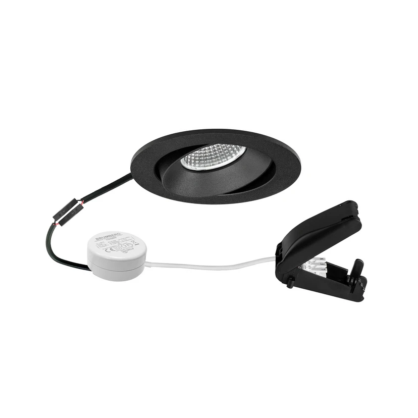 LED recessed ceiling spotlight BB35 with round, dimmable LED driver and connection box The swivelling LED recessed spotlight BB35 can be installed in the ceiling without tools thanks to the installation springs. It is supplied ready for connection to 230 V with a round LED driver that is dimmable via a trailing edge dimmer (RC) and a connection box. The silver reflector with rotationally symmetrical narrow-wide beam light distribution and the transparent polycarbonate cover ensure high luminous efficiency and optimum distribution of the emitted light - incl. round, electronic ballast, trailing edge phase dimmable - incl. connection box, 3-pole for through-wiring - permissible ambient temperature (ta): -20 °C - +25 °C - spot can be swivelled by 20° all round - maximum ceiling thickness 1.5 cm