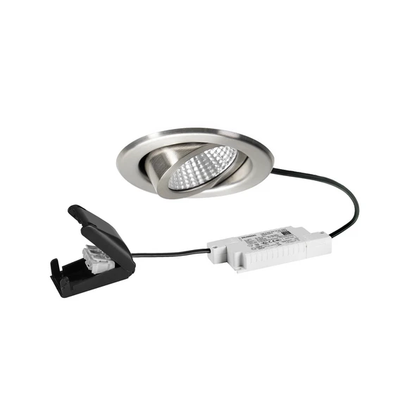 LED recessed spotlight BB09 with LED driver, trailing edge dimmable (RC) and connection box The round LED recessed spotlight BB09 is supplied ready for connection with an LED driver dimmable via a trailing edge dimmer (RC) and a connection box. The spot can be swivelled by 25° all around to align the lighting. The spot can be installed in ceilings with a maximum thickness of 1.3 cm without tools using installation springs - Silver reflector with rotationally symmetrical, deep-wide beam light distribution - Transparent polycarbonate cover for optimum light distribution - Includes electronic ballast, dimmable via trailing edge phase control (RC) - Includes connection box, 3-pin for through-wiring - No cover with thermal insulation material