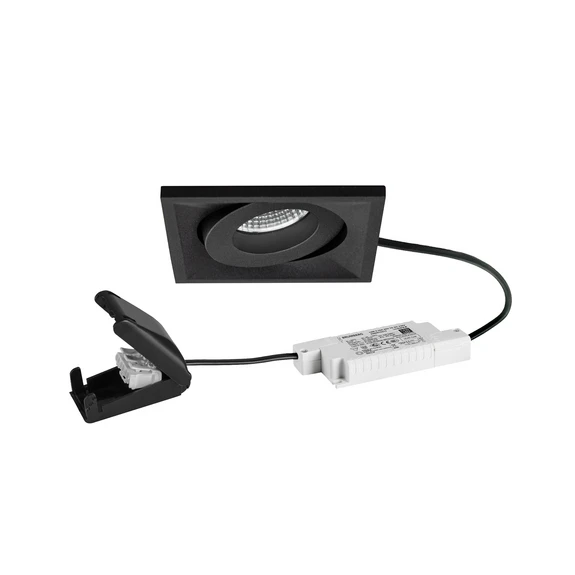 LED recessed ceiling spotlight BB36 with LED driver, dimmable and connection box The LED recessed ceiling spotlight BB36 with square frame can be swivelled by 20° all round to direct the light and can be installed in the ceiling without tools using installation springs. It is supplied as a complete set with a trailing edge dimmer (RC), a dimmable ballast and a connection box. The spotlight is fitted with a silver reflector with rotationally symmetrical, narrow-wide beam light distribution, so that the light is powerful and optimally distributed through the transparent polycarbonate cover - incl. electronic ballast, trailing edge phase-cut dimmable - incl. connection box, 3-pin for through-wiring - permissible ambient temperature (ta): -20 °C - +25 °C - spot can be swivelled by 20° all round - maximum ceiling thickness 1.5 cm