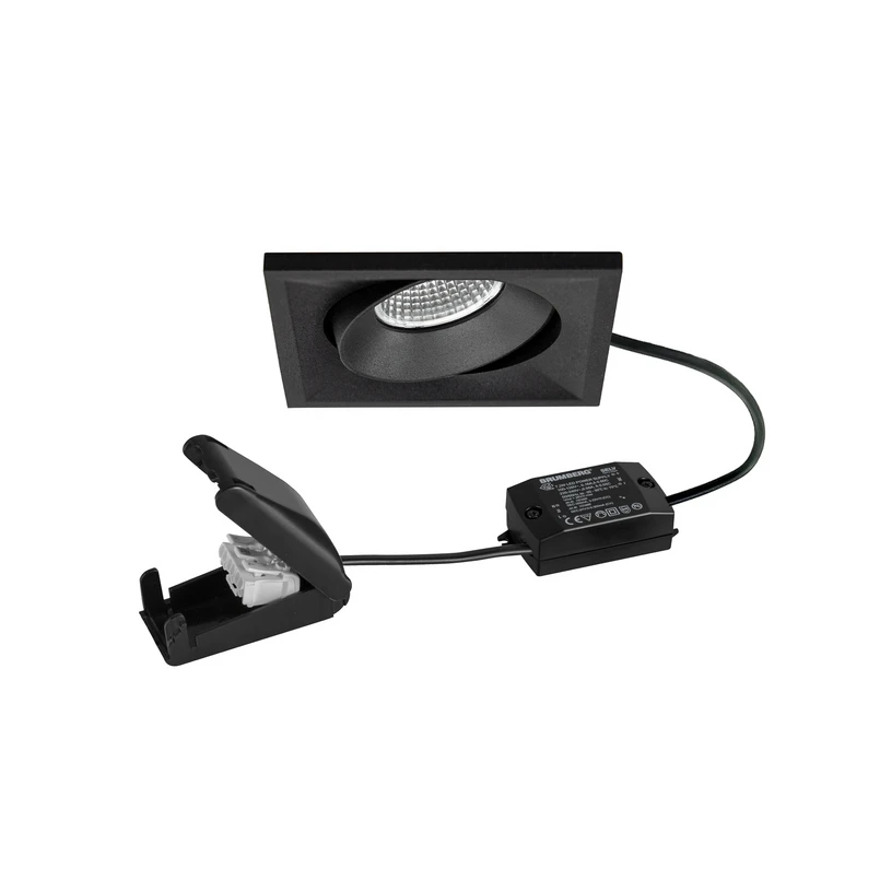LED recessed spotlight BB38 with electronic on/off ballast and connection box BB38 is an LED recessed spotlight with a square frame that can be swivelled through 20° all round and is made of aluminium with a transparent polycarbonate cover. It is supplied ready for connection to 230 V as a complete set with an electronic, switchable ballast and a connection box and cannot be dimmable. Installation in ceilings with a maximum thickness of 1.5 cm can be carried out without tools thanks to installation springs. Equipped with a silver reflector with rotationally symmetrical deep-wide beam light distribution and transparent cover, high luminous efficiency and optimum light distribution are guaranteed - incl. electronic ballast on/off, not dimmable - incl. connection box, 3-pin for through-wiring - permissible ambient temperature (ta): -20 °C - +25 °C - spot can be swivelled by 20° all round - maximum ceiling thickness 1.5 cm