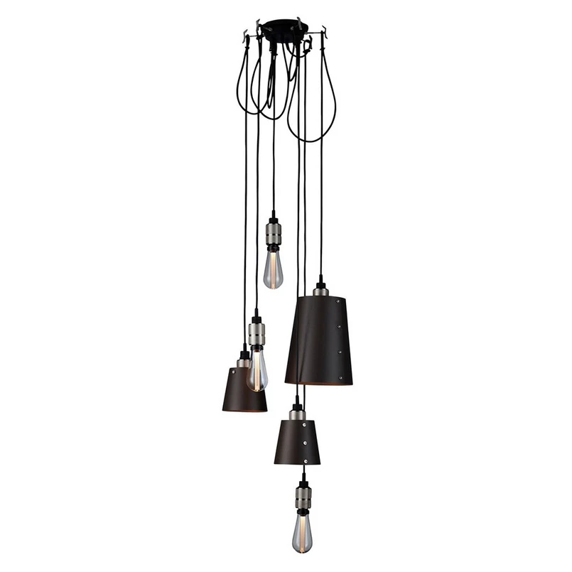Hooked 6.0 mix six-bulb pendant light with variably designed and positionable suspension systems The Hooked 6.0 mix six-bulb pendant light from Buster + Punch is interesting, unusual and very flexible. The six sockets each hang from the canopy on 200 cm long cables. One of the six sockets is surrounded by a large metal shade and two are surrounded by a small metal shade with open screws. The three remaining sockets hang open so that their diamond-cut cross-knurled pattern really comes into its own. In combination with decorative bulbs - the manufacturer offers specially developed lamps (see accessories) - the appearance of the light is completed. Each of the six suspension systems of the Hooked 6.0 mix pendant light can be flexibly attached using the hooks included in the scope of delivery. These can be screwed directly into the canopy all round, but can also be mounted in a different position directly on the ceiling (M5 thread), so that a wide variety of arrangements can be realised depending on the preferred design or lighting task. The impressive Hooked 6.0 mix pendant light is a product of the London-based company Buster + Punch. Founded in 2013, the label not only manufactures lights, but also functional fittings and furnishings made primarily from solid metals that stand out with their own unique character.