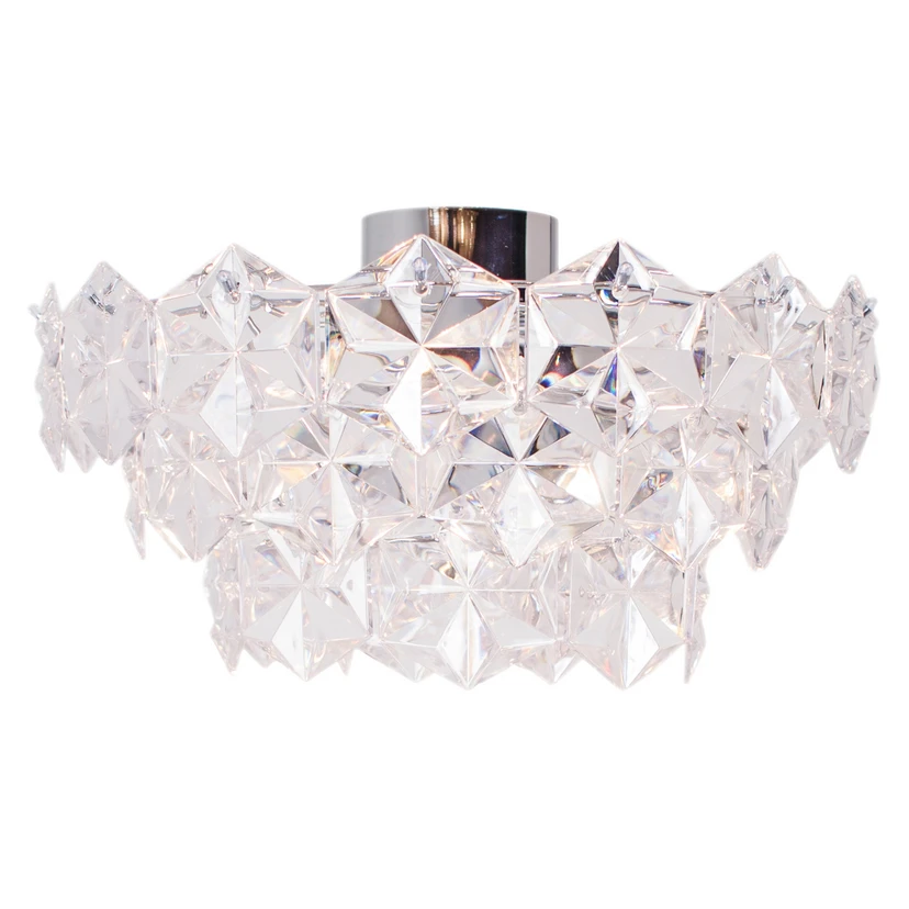 Monarque ceiling lamp with star-like acrylic elementsAround the chrome fixture of the ceiling lamp, star-like elements made of acrylic are arranged in step-like fashion in circles of different sizes. When the light is switched on, this lampshade creates beautiful sparkling patterns on the wall and ceiling. Monarque is a stylish lighting element that can be used in almost all living rooms for general lighting.