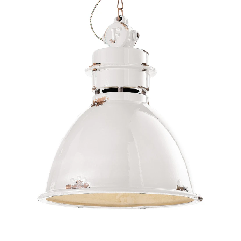 Just like the canopy, the large, dome-shaped shade with two circumferential ring-shaped heels is made of ceramic. Specific flaws in the lacquer give the pendant luminaire its aged character, which is underlined by the rust-brown metal chain suspension. The manufacturer Ferroluce is immortalised with his initial on the upper part of the shade, which serves to attach the suspension.
