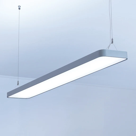 The practical Caleo-P1 office LED hanging light provides an efficient and pleasant illumination of the workplace. As well as directly, light is also given out into the room indirectly. The light, made of the finest extruded aluminium profile (without visible welding seams), features a silver-coloured textured paint surface. The diffuser is also made of excellent, micro-structured special acrylic. A transparent acrylic cover on the ceiling provides protection against dust. The ‘Y’ cable suspension system can be freely adjusted up to a height of 150 cm and features a silver-coloured canopy and a clear-cased cable. This product comes with a dimmable electronic ballast 1-10. However, the 1-10 V dimmer required for lighting regulation is not included. Additionally, an electric, three-core connection cable and a two-core control cable are required for this.