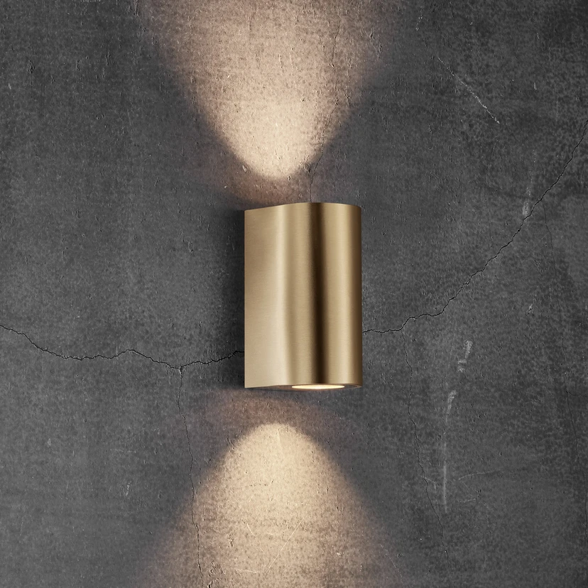The exterior wall luminaire enchants the outdoor area with up-and-down lighting. The rounded body made of die-cast aluminium with its brass finish exudes elegance. The light of the two GU10 lamps is emitted through round openings with transparent glass covers.