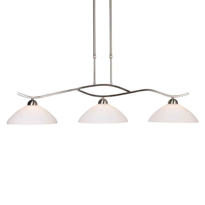 Three-flame Capri pendant lamp in a swinging designThe Capri pendant lamp brings elegant swing into the living room. Three rounded shades made of satin glass are attached to its shapely metal frame. Fitted with energy-saving lamps, they provide economical lighting. Its decorative design and even lighting make it a real eye-catcher above the dining table. Its suspension is adjustable from 80 to 125 cm.