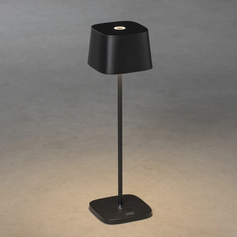 Flexible LED patio light Capri as a table lamp A table on the terrace or at a garden party sets the decorative lamp Capri perfectly in scene. It shines thanks to the integrated battery without power connection, so that the trip hazard cable is banished. Capri can be placed not only versatile, but also variable in light control. The touch switch is used to activate and deactivate and also allows continuous dimming from 100 to 5% and changing the color temperature between 2,700 and 3,000 K. Visually, the monochrome table lamp made of aluminum with the square base and the slightly upward tapering square shade looks simple and modern. The downward shining LEDs provide pleasant, indirect light.- incl. charging station with USB cable- charging time: approx. 2.5 h- burning time per charge: 9 h at 100 %, 20 h at 50 % light output