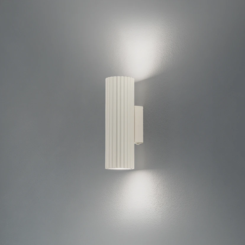 Karbon wall light in beige - spotlighting upwards and downwards The 2-bulb Karbon wall light is a stylish lighting solution that brings modern elegance to any room. Made from high-quality aluminium and presented in an appealing beige shade, this light blends seamlessly into the aesthetics of the living room, dining room or bedroom. Made in Europe, the wall light is characterised by its local origin and stands for quality and design - externally dimmable