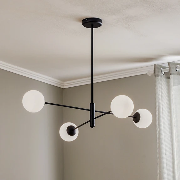 The 1090PL_L1 ceiling light, with 4 bulbs, features an elegant Scandinavian design that impresses with its combination of metal and frosted glass. The stylish black and white colour scheme blends seamlessly into modern living spaces such as living rooms, kitchens or dining rooms. This light not only offers aesthetic enhancement, but also the possibility of individual lighting design, as it is dimmable via an external dimmer.