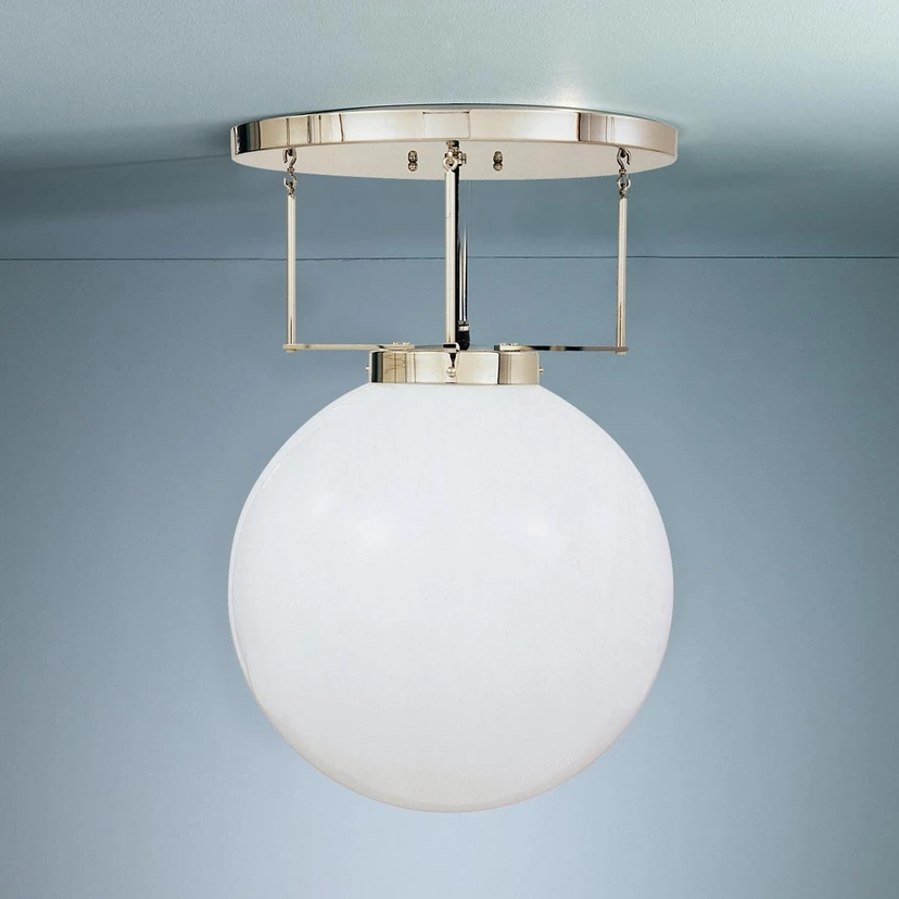 This ceiling light in Bauhaus style was designed in 1926 by Marianne Brandt, one of the best known German designers of the Bauhaus. Even those times, the product convinced unconditionally with its multiple hanging and its simple but effective opal glass ball that perfectly corresponds to the Bauhaus style together with the other components.