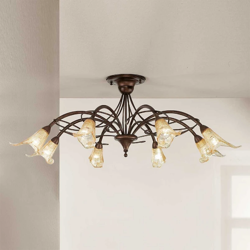 Riccardo ceiling lamp: flower-shaped lampshades This lamp becomes something special through the floral elements, the resemblance of the lampshades to calyxes. The metallic arms of the lamp in dark brown are artfully designed and curved. The arms support the amber-coloured glass shades.