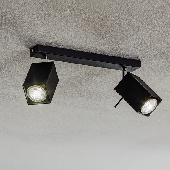 The Square ceiling spotlight in elegant black combines modern design with functional versatility. Made of high-quality steel, this 2-bulb spotlight fits seamlessly into various living areas such as the living room, hallway, kitchen and dining room. The clean lines and timeless colour make it a stylish element of any interior.