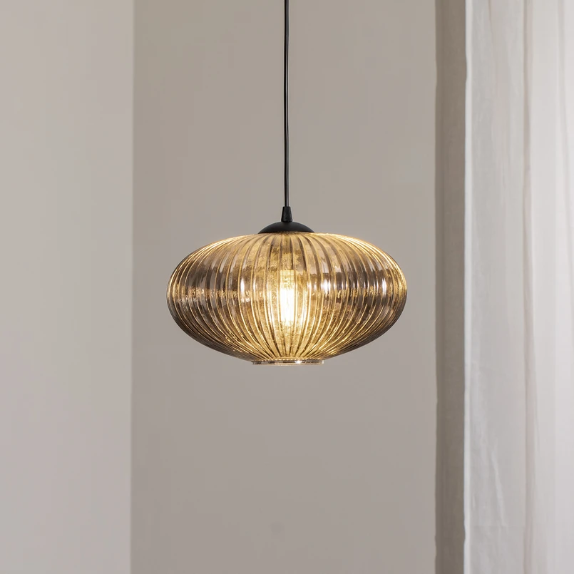 Coco dining table light: elegance and versatility with smoky grey glass The Coco dining table light combines timeless elegance with modern versatility. Made from high-quality glass and robust steel, it shines in a stylish smoky grey and black finish. This lamp is a real eye-catcher in any living room, dining room or kitchen. Careful manufacturing in Europe emphasises the high quality and sophisticated design of this lighting object - Externally dimmable