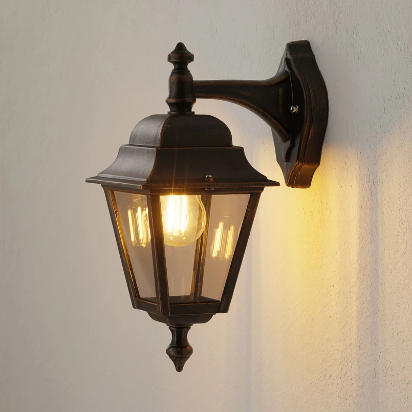 Classic outdoor wall light Toulouse Made from copper-coloured powder-coated aluminium and slightly tinted glass, the downward-hanging outdoor wall light Toulouse is shaped like an antique lantern and looks particularly beautiful on old buildings or buildings with a rustic design. The lightly tinted but clear glass allows it to light its surroundings brightly and safely.