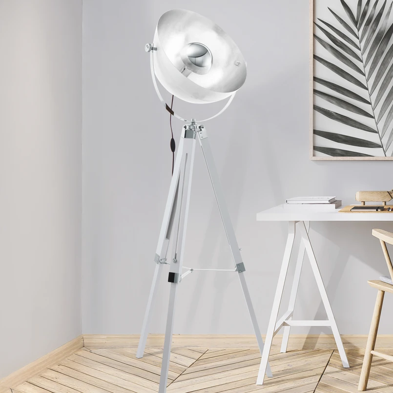 With its mix of materials and colours, the Covaleda floor lamp enriches every room. The three-legged wooden frame is fixed with chrome-coloured hinges. The round shade with white outside colour and the silver inside completes the modern look of the floor lamp perfectly. A chrome-coloured cover serves as glare protection while the light inside the lamp is optimally diffused by the silver surface. In this way the floor lamp creates a pleasant ambience.