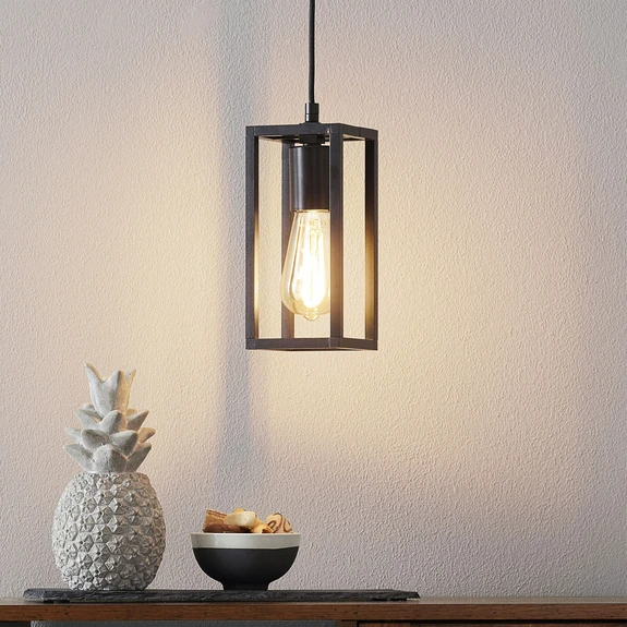 In the case of the Cubic³ pendant lamp, a cable with lamp socket leads down from the discreet rectangular canopy. The lampholder surrounds a brass rectangle that allows a clear view of the inserted lamp, so that the radiating light can escape into the room unhindered on all sides. With the insertion of an aesthetic illuminant, such as a filament or rustic lamp, the Cubic³ pendant lamp is given an antique touch.