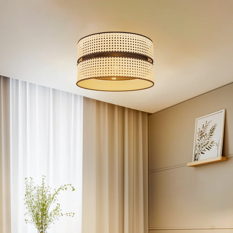 Duo is round and sits directly on the ceiling. The ceiling light is made of rattan and cotton in a harmonious color contrast of beige and black. The rattan shade generates exciting illumination and playfully spreads the light around the room