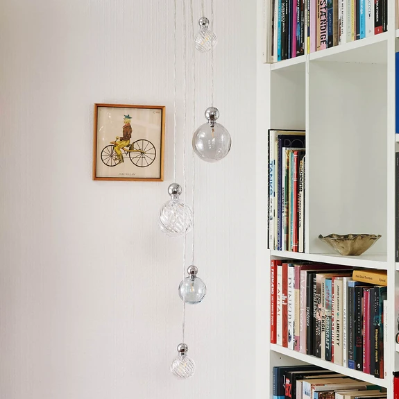 Elegant, modern Uva pendant light with decoratively patterned crystal shade and silver decor The Uva pendant light by designer Susanne Nielsen is an eye-catcher in any contemporary living environment and is available as a series in many different variations from the Danish design label EBB & FLOW. Uva is the Italian word for grape and this is also the shape of the pendant light. The clear crystal glass lampshade is decorated with a very aesthetic swirl pattern in which clear and satin surfaces alternate, creating an enchanting lighting effect. The light emitted by the bulb is also reflected in the silver-coloured metal sphere that sits on the glass. All in all, an exquisite light source that is ideal for both general and area lighting.